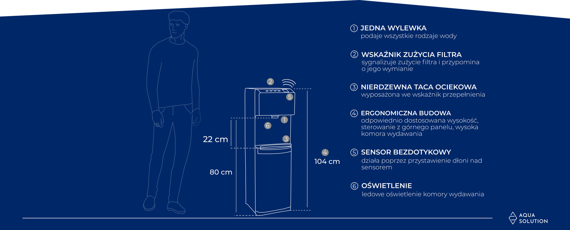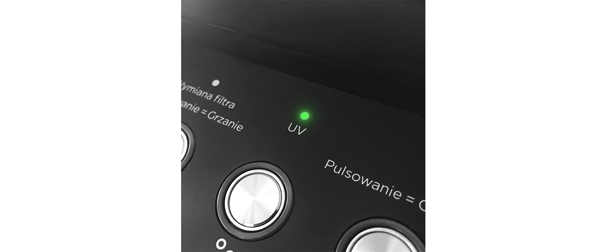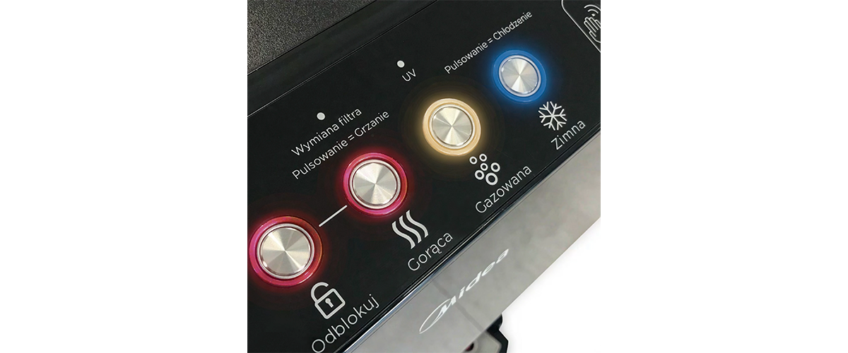 Urządzenie wyposażone zostało w lampę UV, skutecznie eliminującą bakterie i wirusy, co gwarantuje pełne bezpieczeństwo użytkowników. Intuicyjny panel sterowania z podświetlanymi przyciskami LED i sensorem zbliżeniowym umożliwia łatwe i higieniczne nalewanie wody, także w przestrzeniach publicznych.
