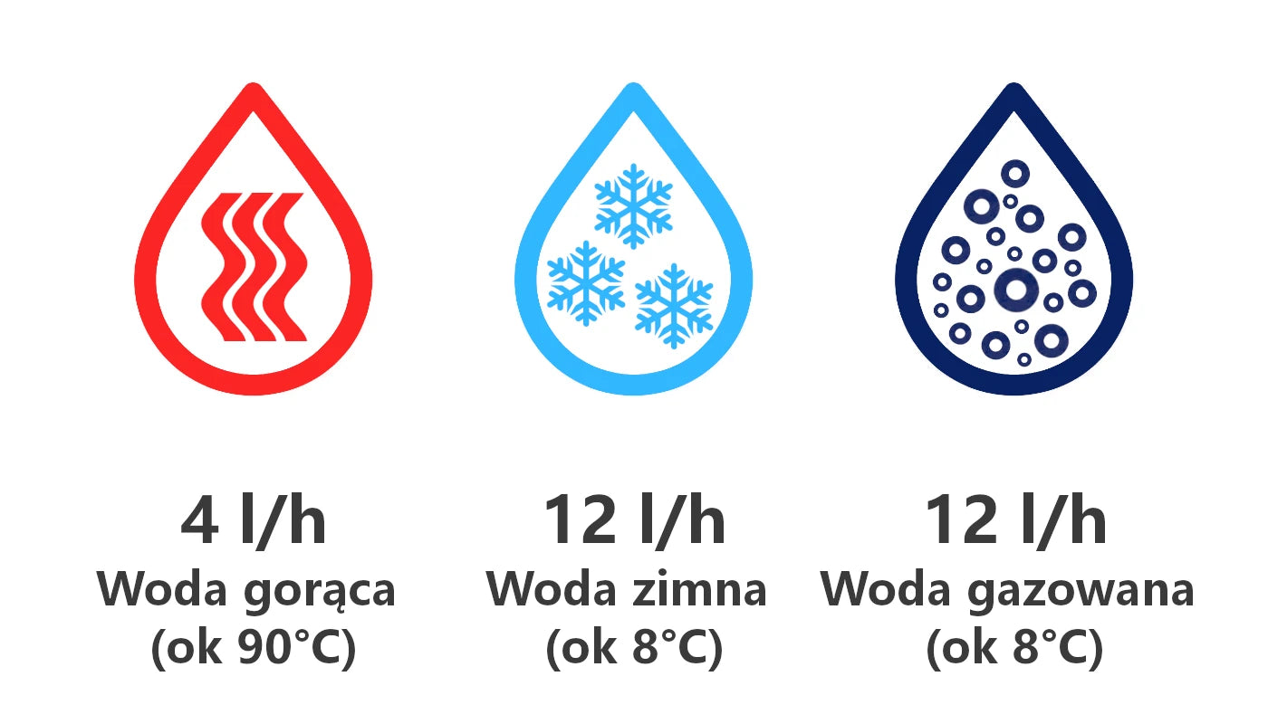 - 3 rodzaje wody w jednym urządzeniu – zimna (ok. 8 °C, do 12 l/h), gorąca (ok. 90 °C, do 4 l/h) i gazowana (ok. 8 °C, do 12 l/h).