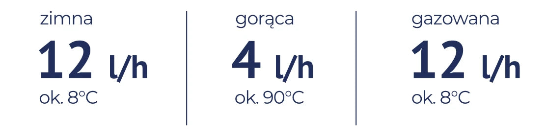 - 3 rodzaje wody w jednym urządzeniu – zimna (ok. 8 °C, do 12 l/h), gorąca (ok. 90 °C, do 4 l/h) oraz gazowana (ok. 8 °C, do 12 l/h).